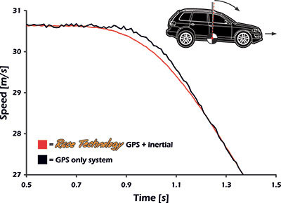 No Speed Overshoot During brake testing, a GPS-only system suffers from speed overshoot, as the brakes are applied the vehicle pitches and the roof mounted GPS antenna accelerates forwards. The time difference as the car decelerates past 100km/h (27.78m/s) and triggers the start of the test is only a few milliseconds (15020ms), but at 100km/h the distance travelled in a few milliseconds is significant (~0.5m). The SPEEDBOX-INS allows the measurement point to be accurately offset to the centre of gravity giving a true speed measurement with no overshoot. The inertial sensors accurately measure pitch and rotation rates to the reference point achieving unbeatable accuracy of just a few cm for all automotive braking tests. |