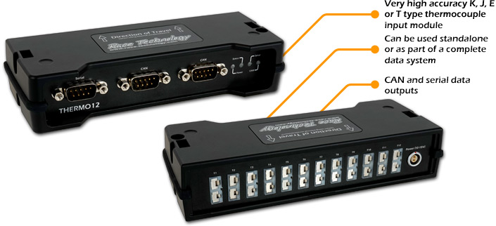 Data is output over Serial and CAN ports, with a fully configurable CAN output. The supplied configuration software allows individual input smoothing and filtering to be applied, as well as data rates for each input. The data is mapped the to the desired temperature channel, for easy identification during analysis. Full software suite supplied: Configuration, live data monitoring and comprehensive data analysis.