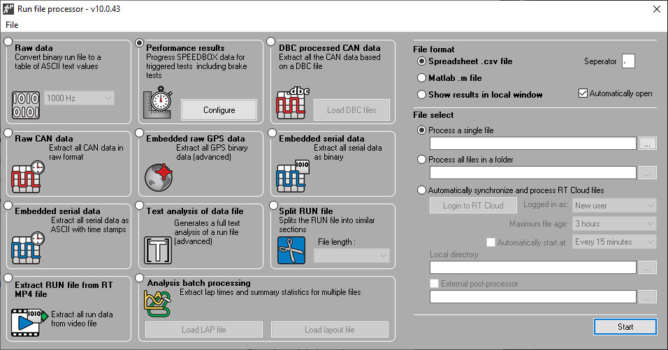 Extract, export and post process logged .RUN file data. Post process triggered test results from SPEEDBOX products, allowing multiple tests to be applied to the same run. Extract CAN, serial and GPS data to .csv or Matlab file format.