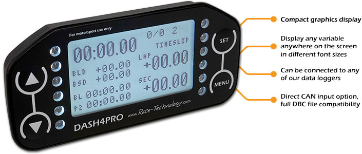 The DASH4PRO is a compact, highly configurable, graphics data display. It can be used with one of products, for example data logger or ECU adapter, or it can be used as a standalone CAN display. The DASH4PRO is often used on formula cars there is very limited room for a display, or in applications there the standard dashboard is retained, but some additional instrumentation is required.