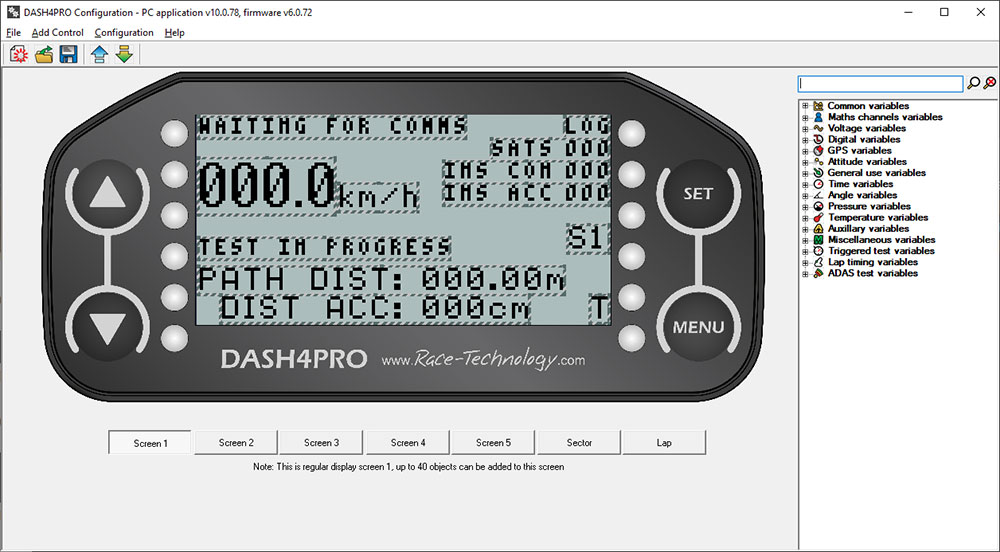 The DASH4PRO is supplied with comprehensive configuration software. The software allows free placement of variables, text and graphs anywhere on 1 of 5 standard screens or pages.