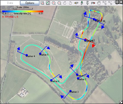 If we look at the fastest lap (select interactve mode in trackmap window - and select the fastest lap in the lap/sector times window), and colour the trackmap by timeslip rate (Trackmap "Options" > Map colour based on > time slip rate [%] ) we can see that the red areas are where time was lost compared to your theoretical fastest lap. Quickly highlighting these areas allows you to concentrate on where the largest improvements can be made.