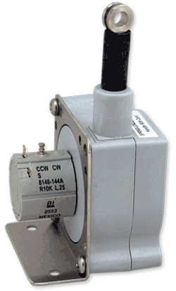 A high quality "string extension potentiometer" that senses the distance the wire is pulled from the sensor body. Ideal for sensing steering angle. With relatively non-critical alignment requirements, compact size, and ease of installation wire rope actuated transducers are the linear measurement system of choice.