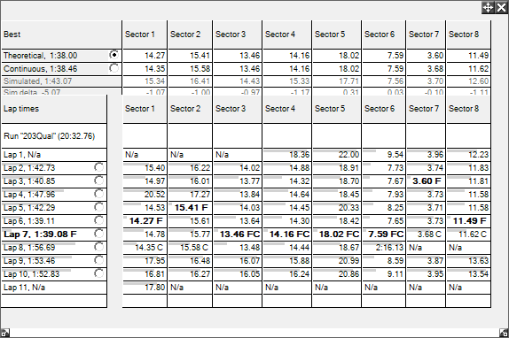 Step 3: This will display a table showing all of the sector times.