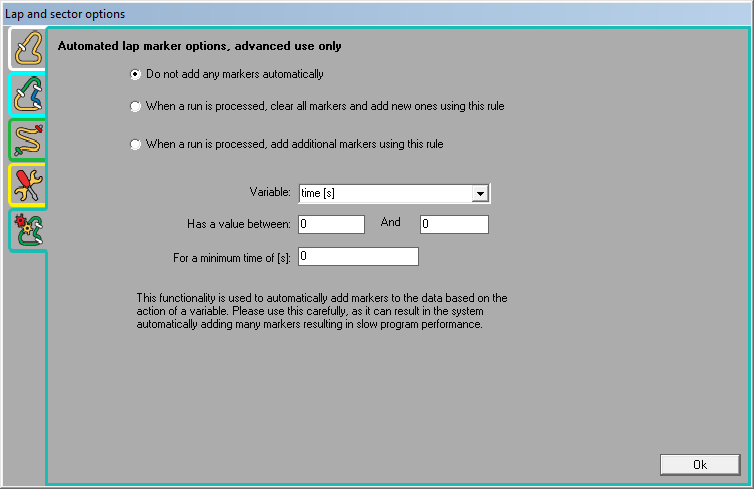 NOTE: The options on this tab allow you to automatically add markers to the data based on the action of a variable. Please use this carefully, as it can result in the system automatically adding many markers resulting in slow program performance.