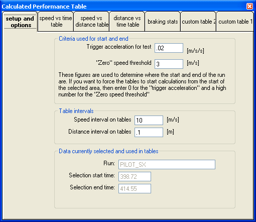This has several applications. Obviously, it is ideal for simply extracting performance statistics for magazines etc, however, it is also very useful to check the efficiency of the brakes after a race, etc. There are very few options for the Performance Calculations: