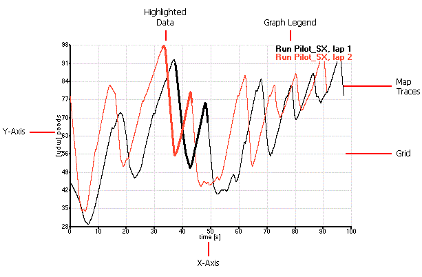 - Graph Legend - This details what part of the run the traces represent. They are also colour co-ordinated with the map traces.