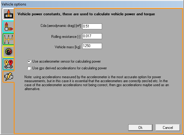 The Power tab allows you to enter the aerodynamic drag for the vehicle, the rolling resistance for the wheels and the mass of the vehicle. To calculate the aerodynamic drag (CdA) and rolling distance, click here.