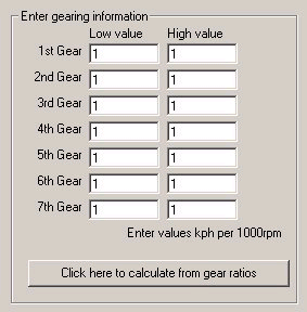 In each box you need to enter the range of values of kph per 1000rpm that are appropriate for that gear. For example a typical value for 5th gear might be 44kph per 1000rpm, in this case is might be realistic to put a lower limit of 40 and an upper limit of 48, to account for things like slip of the tyre and the road and the change in the rolling diameter of the tyres with wear etc. Normally it is recommended to make the ranges as wide as possible but without any overlap between them. For road cars and motorcycles the figure for kph/1000rpm is typically given in the owners manual. For race or non-standard cars and bikes this information isn't so readily available - in this case you can either calculate it yourself, or you can click the "click here to calculate from gear ratios" to open the following dialog box:
