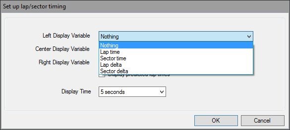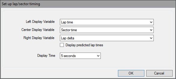 The DASH2 is able to display lap timing data which has been generated by an external data logger such as a DL1. This is configurated by clicking on the "Set up lap/sector timing" icon in the DASH2 configuration software: