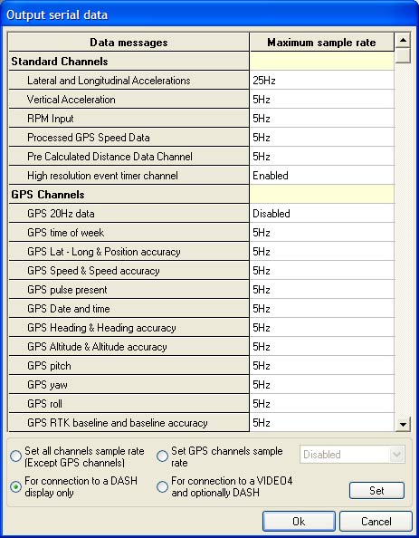 It is possible to set the rate for all channels except GPS data, and for all GPS channel simultaneously, to do this, click the box for the option you require, select the speed from the box on the right and then click on Set.