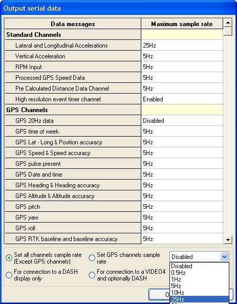 If there is a specialist requirement to change certain channels (for example when RPM data isn’t needed because the DASH2 has an RPM input) each channel can be selected by clicking on the box at the side and then using the drop down list to select the rate: