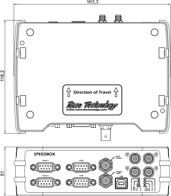 Following figures show the physical dimensions and mounting hole dimensions of the SPEEDBOX. All dimensions given are in millimeters.