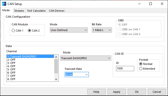 Using the screen below, set up the CAN to the “User Defined” mode at a bit rate of 1Mbit/s.