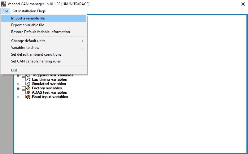 Open Var and CAN Manager from Race Technology program launcher > Load new variable file using File > Import a variable file: