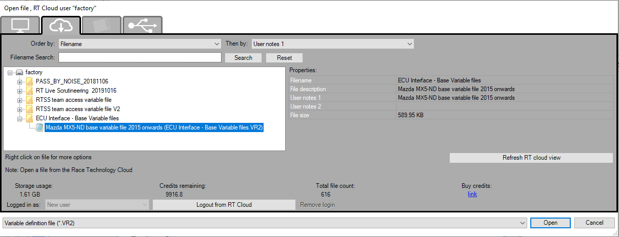 - Base variable files available in factory Race Technology V10 Cloud area.