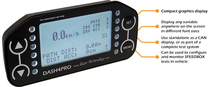 The DASH4PRO is a powerful data display, that can be configured for a wide range of application. It can be used to display CAN data from 3rd party products or data and advanced lap times from Race Technology’s range of data logging products. It is housed in small metal case designed for dashboard or steering wheel mounting, there is also an option for a suction mount for windscreen mounting. It can be used to provide either supplementary information along side other instruments, or as the primary source of information in race applications.