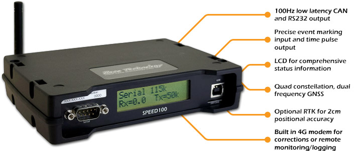 The SPEED100 is a multi constellation GNSS receiver with built in 4G LTE radio modem, with output update rate of 100Hz. The SPEED100 can be upgraded to RTK 2cm position when connected to either a web or radio modem based correction source, data can be also be optionally logged to the Race Technology cloud service.