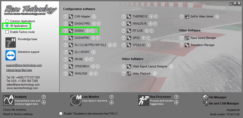 Open the DASH2 configuration software assistant from the Race Technology program launcher: