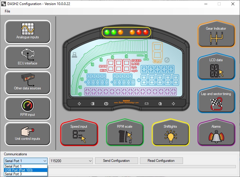 When the DASH2 configuration assistant loads it will be automatically setup for communication with a logger. Connect the DASH2 to the PC via the serial port connector on the supplied wiring harness. You may also need to use a USB to serial adaptor, if your PC does not have a direct serial port: