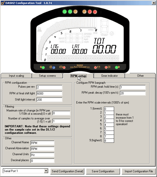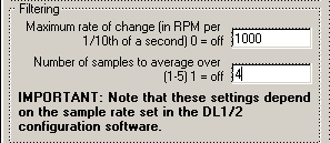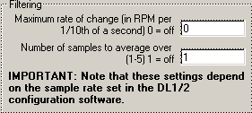 If, however, the values were set to 1,000 and 4, then the maximum rate of change that would be displayed on the DASH2 screen would be 1,000 RPM every 1/10th of a second. The average reading, as taken over every four samples, would also be shown on screen.