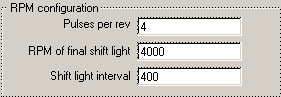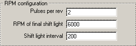 With these settings, the shift lights (the LEDs along the top of the DASH2), will all be turned on and flickering when 6,000 RPM is reached. The lights will cease flickering once the RPM drop by 200 below this level. When the RPM drop by 200 more, one of the LEDs will cease to be lit. This process will continue for every 200 RPM dropped. The DASH2 will expect two pulses for every revolution.