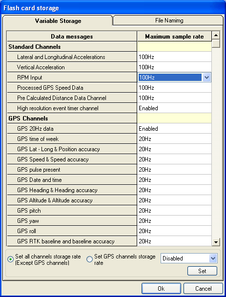 - Click on the Flash Card Storage tab and set the speed at which the RPM input will be logged to the memory card.