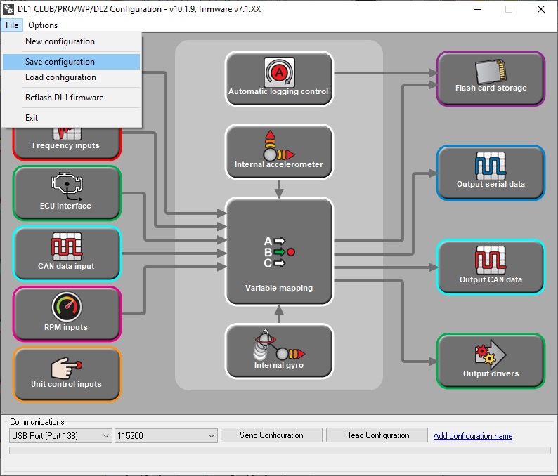 5) Save the configuration to the PC, so there is a back up copy. Go to File & Save Configuration: