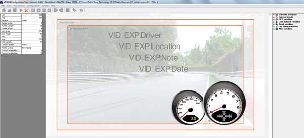 The "Video Overlay Configuration" is the software that you need to use to design the graphics overlay for the GoPro video recordings. The video overlay can be almost any combination of bitmaps, dials, bargraphs, digital displays, track maps, dynamic lines and simple texts. It is also possible to only show particular graphics under particular conditions making it very flexible and powerful.