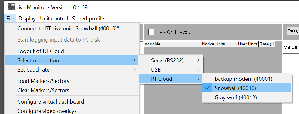 2. After you login to your RT Cloud account, cloud connected devices registered under your account will be listed under the menu item “File -> Select connection -> RT Cloud”