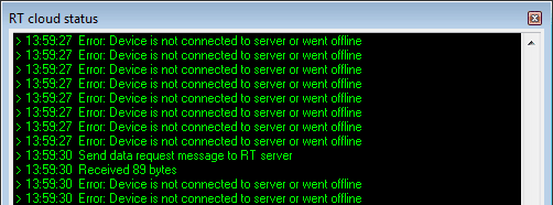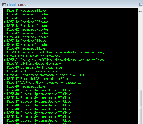 If you have issues when connecting to the RT Cloud or during an active connection, you can check what is going on behind the scenes by opening the RT Cloud Status dialog. (Display -> Show RT cloud status)