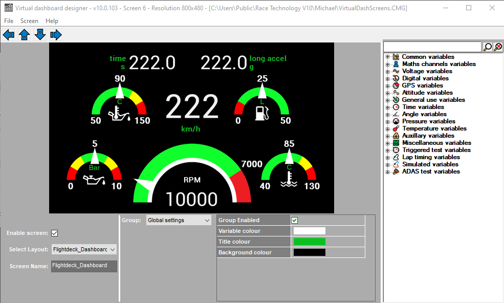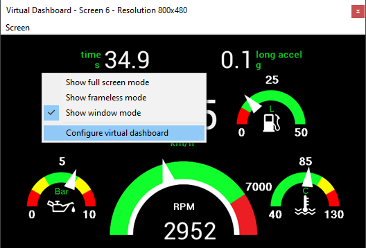 The Virtual dashboard consists of 10 configurable data screens which can be used to display any of the variables within the software. To load up the Virtual dashboard, go to Display -> Show Virtual dashboard.
