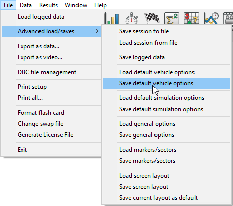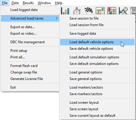 To load a previously saved Vehicle Options file (.CAR), go to File > Advanced load/saves > Load default vehicle options.