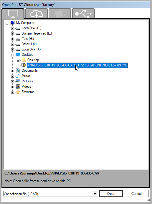 Select the file you want to load by left clicking on the file and click on "Open" to load the vehicle options settings saved in that file to the analysis program.