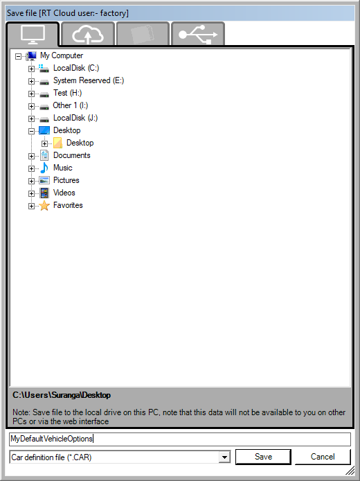 You can either save vehicle options to a new file by selecting a directory, entering a file name and clicking on "Save",