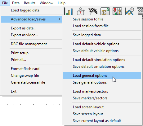 To load a previously saved General Options file (.CFG), go to File > Advanced load/saves > Load general options.