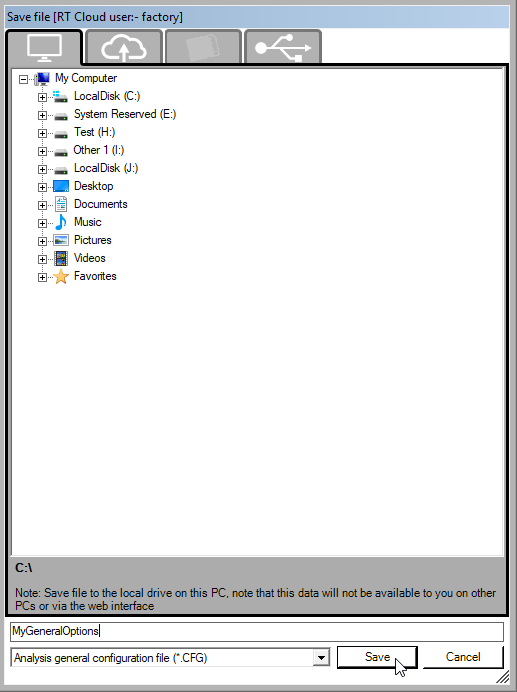 You can either save general options to a new file by selecting a directory, entering a file name and clicking on "Save",