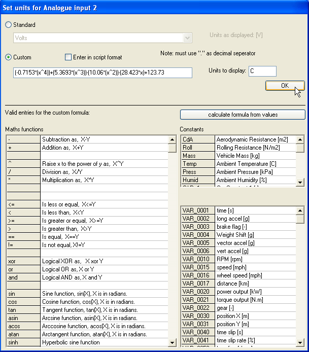 Alternatively, the formula may contain references to constants that can be included in the definition of the car details: VAR_0023 * CAR_1 - CAR_2. The benefit of this approach is that the same variable would be available for several different cars automatically if the car definition file is set up correctly. Note that the car constants don't have any "built in" significance, they are included to aid in the structured use of the user variables and can be used for any application as required.