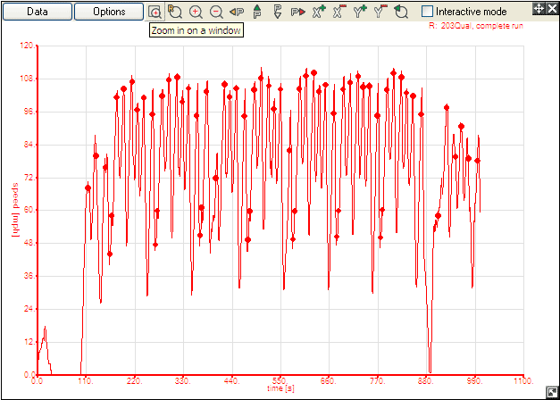step 2: Once the graph has been opened, you may zoom in to the specific part of the run (in this case, the initial acceleration from 0-60) that you wish to analyse, by selecting the appropriate icon at the top of the graph,