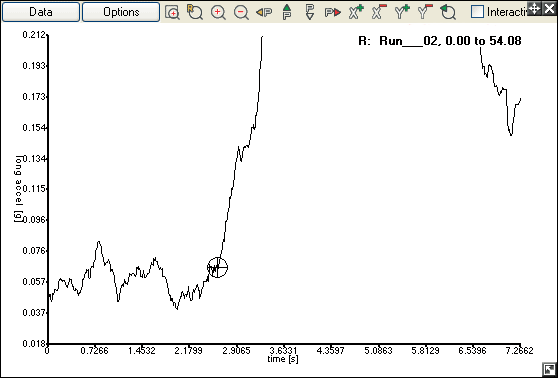 Plot an xy graph, showing longitudinal acceleration. You should be able to clearly see the point at which the vehicle made it's initial pull away from the stat line. (Use the zoom feature to find the precise moment). Put the marker over this point.