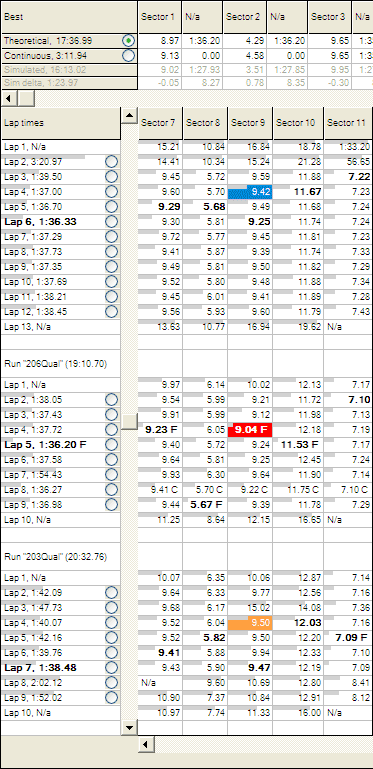 If, for example, you wanted to compare the fastest time through sector 9 for 3 different runs, you would highlight them in the Lap And Sector Times table: