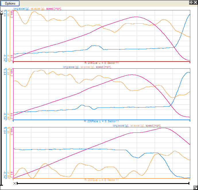 When you open up the Quick XY Graph, the default settings will show the longitudinal and lateral accelerations and speed against time. The graph will also initially be set to group by variable, meaning that the longitudinal acceleration for all the highlighted data will be shown on the same graph: