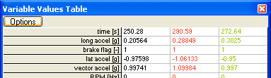 The way the data is represented changes on how it's selected. If you have a singular point selected on the Track Map or the XY Graph, then the data displayed will be specific to that point on the graph/map. If you have more than one trace displayed on the track map or graph, then the Values Table will display all the variable data relevant to all the points selected. the data will be colour co-ordinated with the points you have selected. For example, if you had selected three laps on the track map and clicked to select one point on all three maps, the values table would look like this: