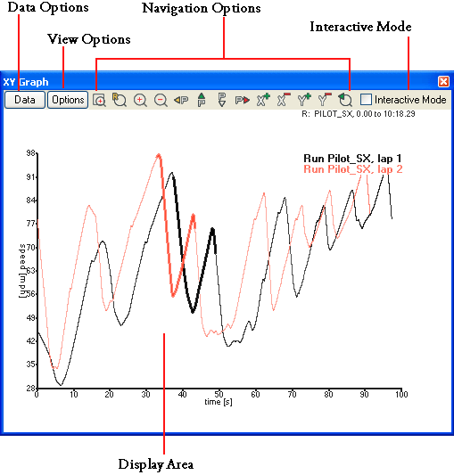 button. When you open a new graph, it will initially display the speed against time for the whole of the first run you loaded, with any laps or sectors you have highlighted in the Laps And Sector Times table highlighted on the trace. If no are loaded, then no data will be displayed.