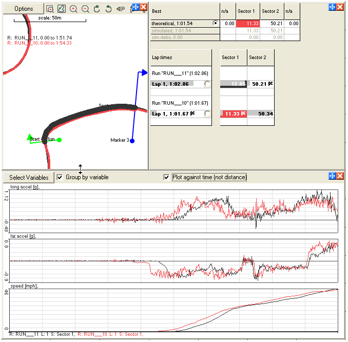 5. Once this is done then the start points of both data sets are lined up perfectly, overlaying the first sector from each of the runs they can be compared