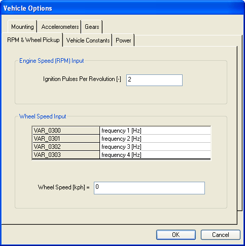 Because there are 4 frequency inputs on the DL1, there are many ways that the user may want to calculate wheel speed on the DL1. To allow maximum flexibility, the software allows you to enter a formula to define wheel speed. For example, if you have a single wheel speed sensor attached to a wheel with 5 pulses per revolution and a rolling radius of 2.1m and the input goes to the first frequency channel then: