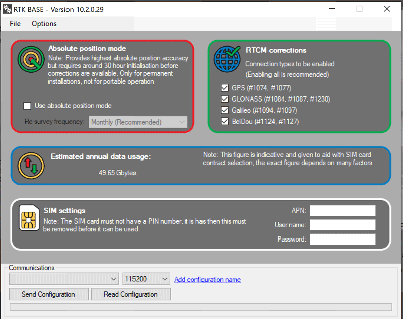 The RTK BASE Portable is set up using a simple configuration software from a PC over the USB port.