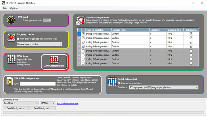 If required, the RT LIVE v2 unit can be configured over its serial port using the supplied configuration software.