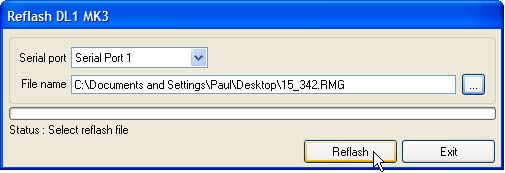 To perform the reflash, select File -> Reflash DL1 MK3 firmware. Select the serial port on the configuration software and select the reflash file. Click on Reflash to start the reflash procedure. It might take around 10 seconds to start the reflash procedure from when the button is pressed.