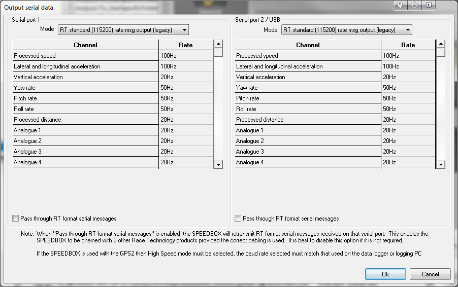 For each port there is an option to pass through RT format messages. When this is ticked, any Race Technology format messages will be decoded and retransmitted along with the built in data. This applies to data messages; the unit will automatically re-transmit RT configuration messages to other equipment as required without having to tick these checkboxes. It is recommended that these checkboxes are left unticked unless data re-transmission is definitely required.